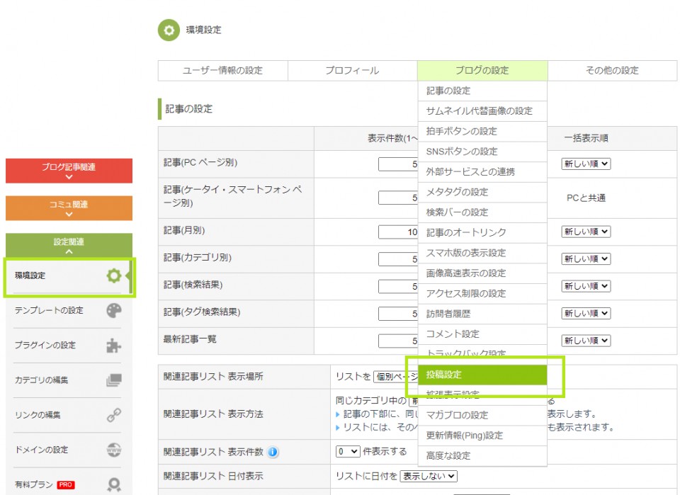 「設定」>「環境設定」>「ブログの設定」>「投稿設定」で設定します。