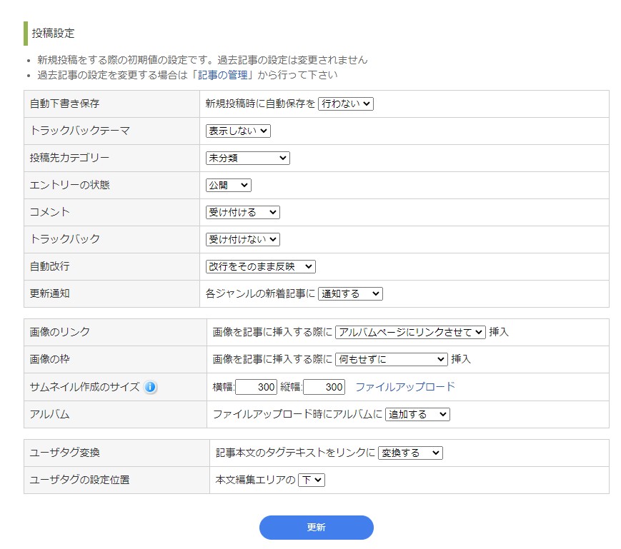 「新しく記事を書く」および「過去の記事の管理」で、記事を編集する項目の初期設定をします。