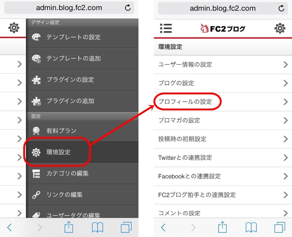 新画面の場合は、左側の三本線(ハンバーガーメニュー)から環境設定<プロフィールをタップします