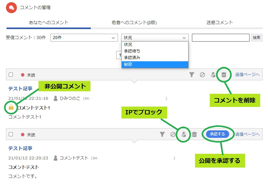また、コメント管理のページで、秘密コメントのみを抽出してソートすることもできます。