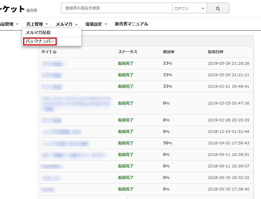 画面上部の「メルマガ」というリンクをクリック後、「バックナンバー」をクリックします。