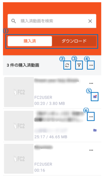 ①動画の表示を「購入済み」または「ダウンロード」のいずれかに切り替えます。