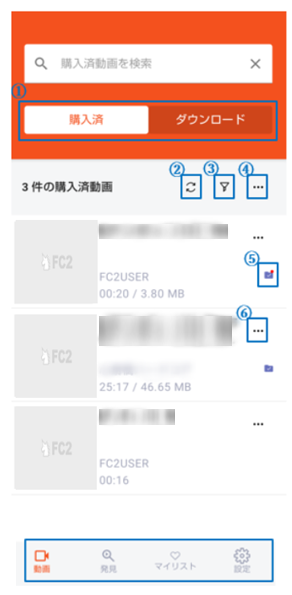 ①動画の表示を「購入済み」または「ダウンロード」のいずれかに切り替えます。