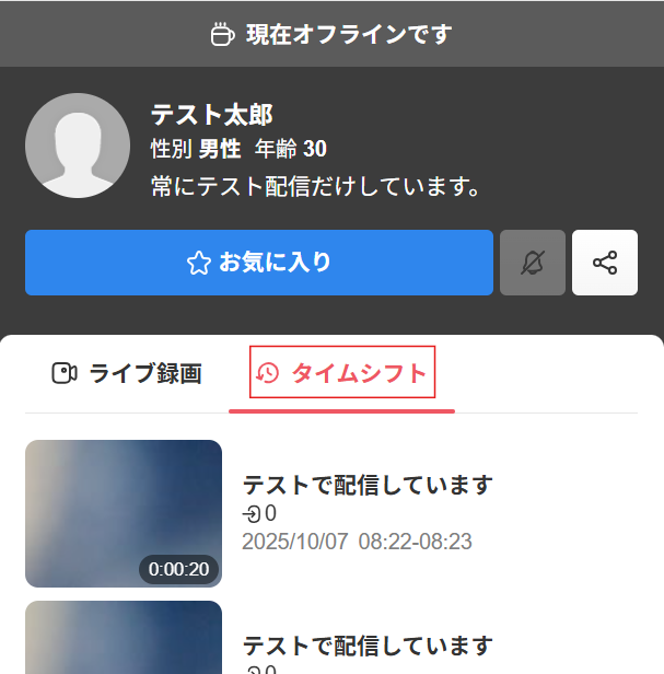 ▼プロフィールページの「タイムシフト」をタップしてください。