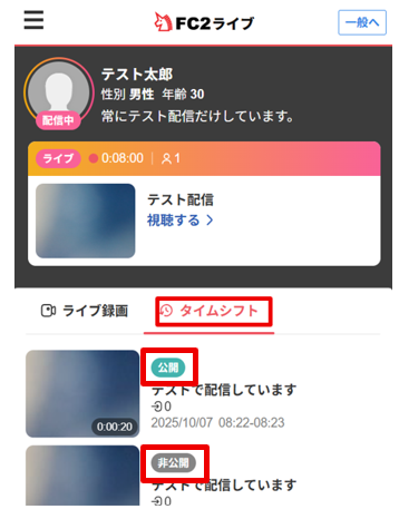 ▼各タイムシフトのタイトル上部に公開状況ステータスが表示されます。