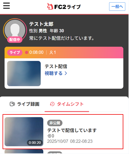 ログイン後、ライブトップ画面左側「過去の配信一覧」から「タイムシフト」ボタンで