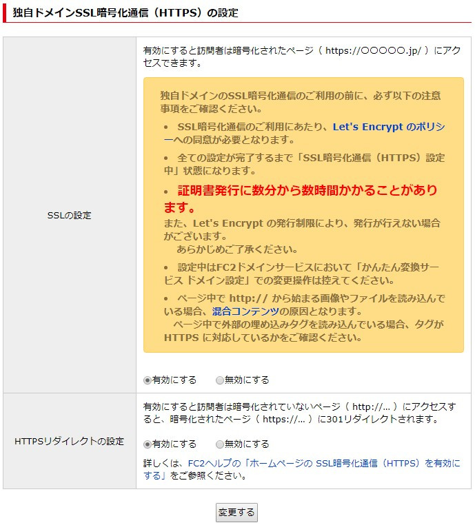 3.「SSLの設定」で「有効にする」を選択して「変更する」ボタンをクリック